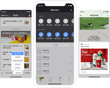 已接入公眾號(hào)自定義菜單、圖文群發(fā)、好友分享、推廣二維碼、付費(fèi)廣告、置頂小程序、附近的小程序、微信發(fā)現(xiàn)等60+入口。把握微信流量,提升獲客。